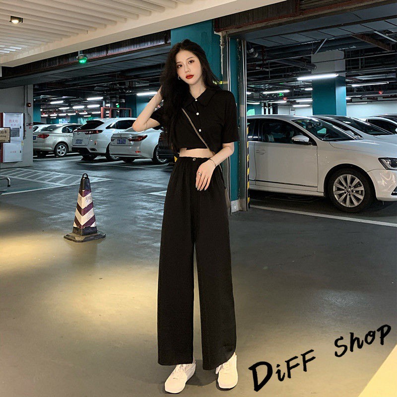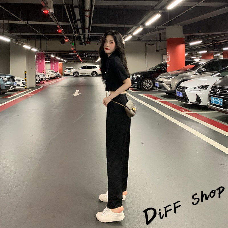 Korean style temperament petite slimming short top + wide pants two-piece suit short-sleeved top short-sleeved T-shirt pants long pants casual pants