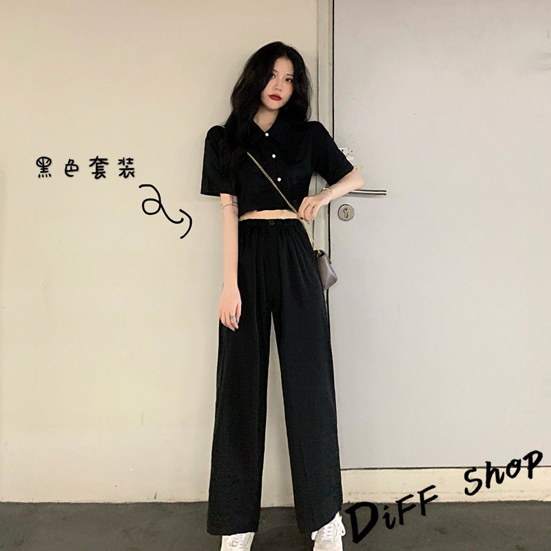 Korean style temperament petite slimming short top + wide pants two-piece suit short-sleeved top short-sleeved T-shirt pants long pants casual pants