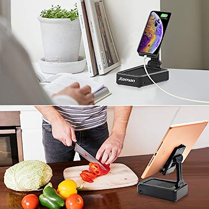 • Wireless Bluetooth Speaker: This cell phone stand with portable Bluetooth speaker delivers stunning sound with enhanced bass, tight mids, and crystal clear highs without distortion at any volume. Moreover, the speaker comes with a built-in microphone.