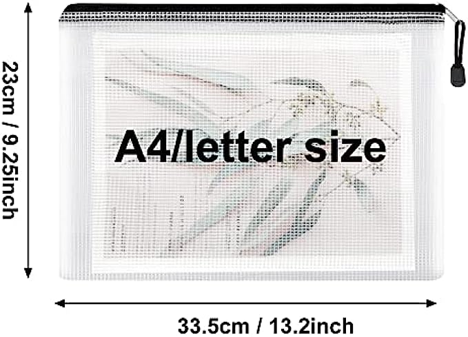 • PRODUCT SIZE: 13.2" x 9.25"/33.5cm x 23cm. The mesh zipper pouch larger than letter size/A4 size, please confirm the size of the product carefully before purchase.