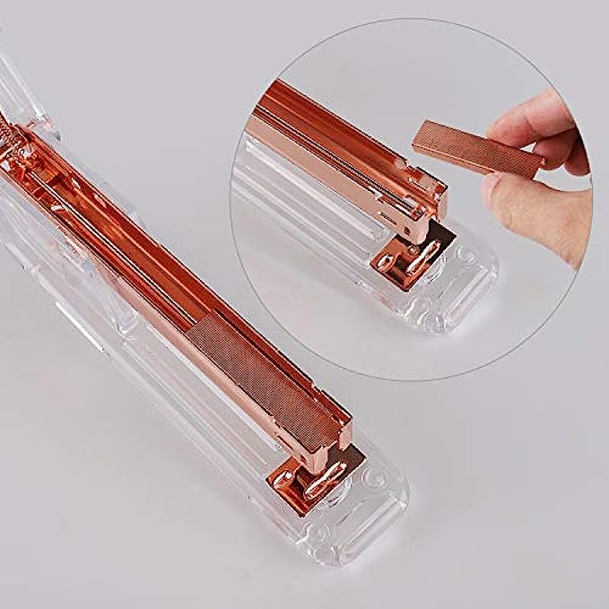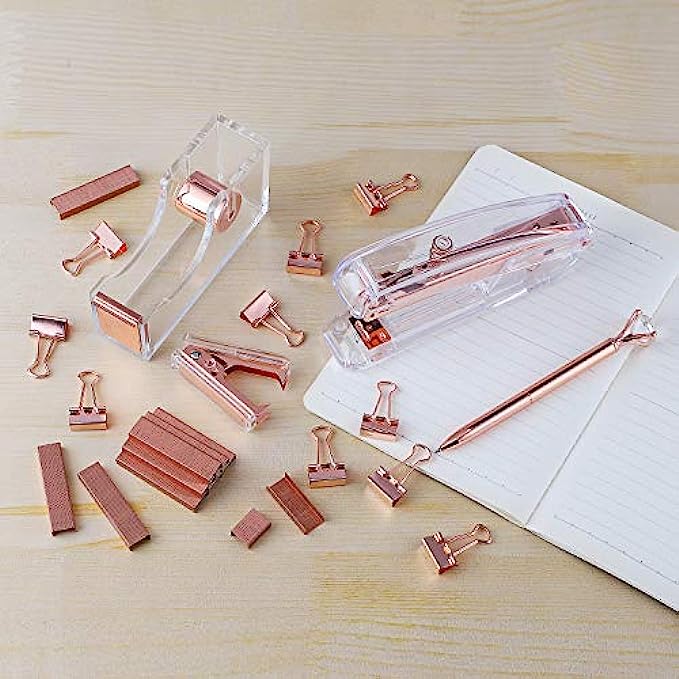 • PACKAGE INCLUDE:1xStapler 1xStaple Remover 1xTape Dispenser 1xstaples 1xBig Diamond Ballpoint Pen 10xBinder Clips (All Rose Gold)
