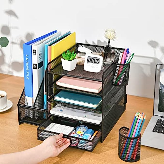 Marbrasse Desk Organizer with File Holder, 5-Tier Paper Letter Tray Organizer with Drawer and 2 Pen Holder, Mesh Desktop Organizer and Storage with Magazine Holder for Office Supplies (Black)