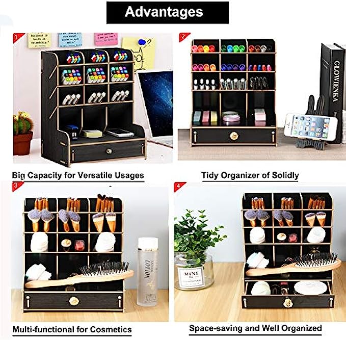 ✎【STRONG & STURDY ORGANIZER】: Made of environmental friendly wood board materials,sturdy construct,safe and nontoxic. Assembled chimeric design, Strong and durable. Superb craftsmanship with specially varnished for glossy surface ,excellent touch feeling and funny DIY design makes it be a perfect gift choice .The desktop organizer shelf is easy to clean and can protect from dust and water.