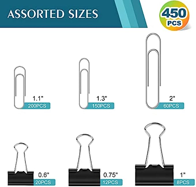 Assorted Sizes: Including 200 pieces 1.1'' , 150 pieces 1.3'', 60 pieces 2'' paper clips, 20 pieces 0.6'', 12 pieces 0.75'' , 8 1'' binders. Three sizes of large, medium and small meet your different needs and manage files of different thicknesses and sizes.
